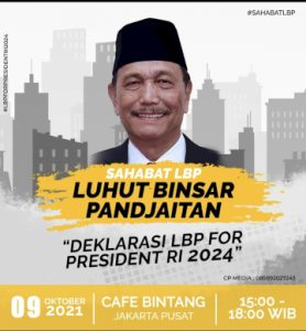 pojokdepok.com -, Sebuah flyer berisi informasi penyelenggaraan deklarasi dukungan terhadap Menteri Koordinator Kemaritiman dan Investasi (Menko Marves) Luhut Binsar Pandjaitan sebagai Capres 2024 beredar luas di media sosial, Senin siang (4/10/2021). Informasi itu mengatasnamakan relawan LBP bernama #SAHABATLBP. Sore ini, mereka berencana