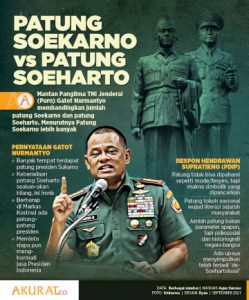 News Mantan Panglima TNI Jenderal (Purn) Gatot Nurmantyo membandingkan jumlah patung Soekarno dan patung Soeharto. Menurutnya Patung Soekarno lebih banyak