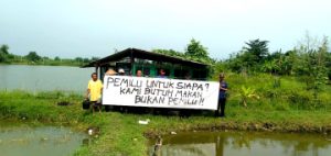 pojokdepok.com -, Wacana penundaan Pemilu 2024 rupanya tidak hanya diperbincangkan elite di Jakarta. Buktinya, petani tambak bandeng dan udang di Kecamatan Buduran, Kabupaten Sidoarjo ikut menyoroti. “Pemilu untuk siapa? Kami butuh makan, bukan Pemilu,” demikian bunyi tulisan dalam spanduk yang dibentangkan para