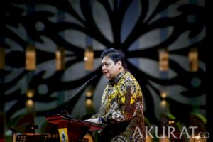 Ketua Umum Partai Golkar Airlangga Hartarto memberikan sambutan serta pidato politik dalam acara HUT Partai Golkar di Kantor DPP Golkar, Jakarta, Sabtu (23/10/2021). Kegiatan perayaan yang dihadiri Wakil Presiden ke-10 dan 12 Jusuf Kalla dan Mantan Ketum Golkar Akbar Tanjung tersebut mengusung