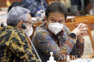 Menteri Kesehatan Budi Gunadi Sadikin (kanan) berbincang sebelum mengikuti rapat kerja bersama Komisi IX DPR di Kompleks Parlemen MPR/DPR-DPD, Senayan, Jakarta, Selasa (22/3/2022). Rapat tersebut membahas pergeseran pagu alokasi Kementerian Kesehatan (Kemenkes) Tahun Anggaran 2022 sesuai perubahan struktur organisasi dan tata kerja