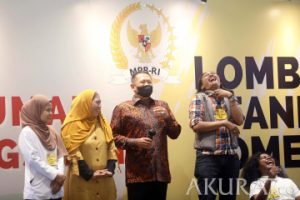 Ketua MPR Bambang Soesatyo bersama para finalis Lomba Stand Up MPR Rumah Kebangsaan usai perlombaan di Lobby Nusantara II, Kompleks Parlemen MPR/DPR-DPD,Senayan, Jakarta, Selasa (29/3/2022). Perlombaan Stand up comedy ini dianggap sebagai salah satu metode yang paling strategis dalam melaksanakan fungsi kritik, saran