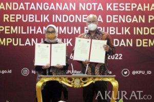 Ketua KPU Ilham Saputra (kiri) bersama Direktur Eksekutif Perkumpulan Pemilu untuk Demokrasi (Perludem) Khoirunnisa Nur Agustyati (kanan) menandatangani Nota Kesepahaman di Gedung KPU, Menteng, Jakarta Pusat, Kamis (6/1/2022). KPU bekerjasama dengan Perludem tersebut untuk pembaruan dari Nota Kesepahaman akes data terbuka dan Digilitalisasi