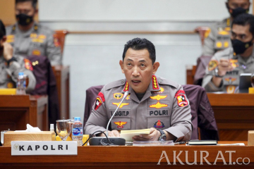 Kapolri Jenderal Polisi Listyo Sigit Prabowo saat mengikuti rapat kerja dengan Komisi III di Gedung Nusantara II, Kompleks Parlemen MPR/DPR-DPD, Senayan, Jakarta, Senin (24/1/2022). Rapat kerja ini membahas evaluasi terkait kinerja dan capaian tahun 2021 dengan pagu anggaran pada tahun tersebut sebesar