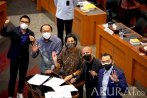 Menteri Keuangan Sri Mulyani bersama Ketua Badan Anggaran (Bangar) Said Abdullah beserta Wakil Ketua Bangar Muhidin Mohamad Said, Edhie Baskoro Yudhoyono dan anggota Bangar Eko Hendro Purnomo menandatangai pengesahan usai rapat kerja di Gedung Nusantara II, Kompleks Parlemen MPR/DPR-DPD, Senayan, Jakarta, Selasa