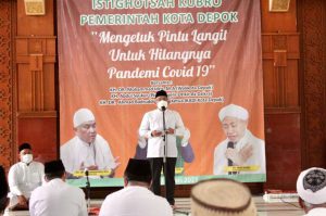 Wali Kota Depok, Mohammad Idris bersama sejumlah pejabat di Perangkat Daerah (PD) menggelar Istighosah Kubro bertajuk ‘Mengetuk Pintu Langit Untuk Hilangnya Covid-19’ di Masjid Balai Kota Depok, Selasa (19/01/2021) pagi. Melalui doa bersama ini diharapkan pandemi Covid-19 bisa segera berakhir. Menurut Wali