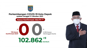 pojokdepok.com – Penyebaran Coronavirus atau Covid-19 di Kota Depok catatkan 0 kasus baru dan kematian. Berdasarkan data terbaru Pusat Informasi Covid-19 Depok (Picodep) pada Minggu 17 Oktober 2021, tidak terjadi penambahan kasus baru dan kematian akibat Covid-19. Wali Kota Depok, Mohammad Idris