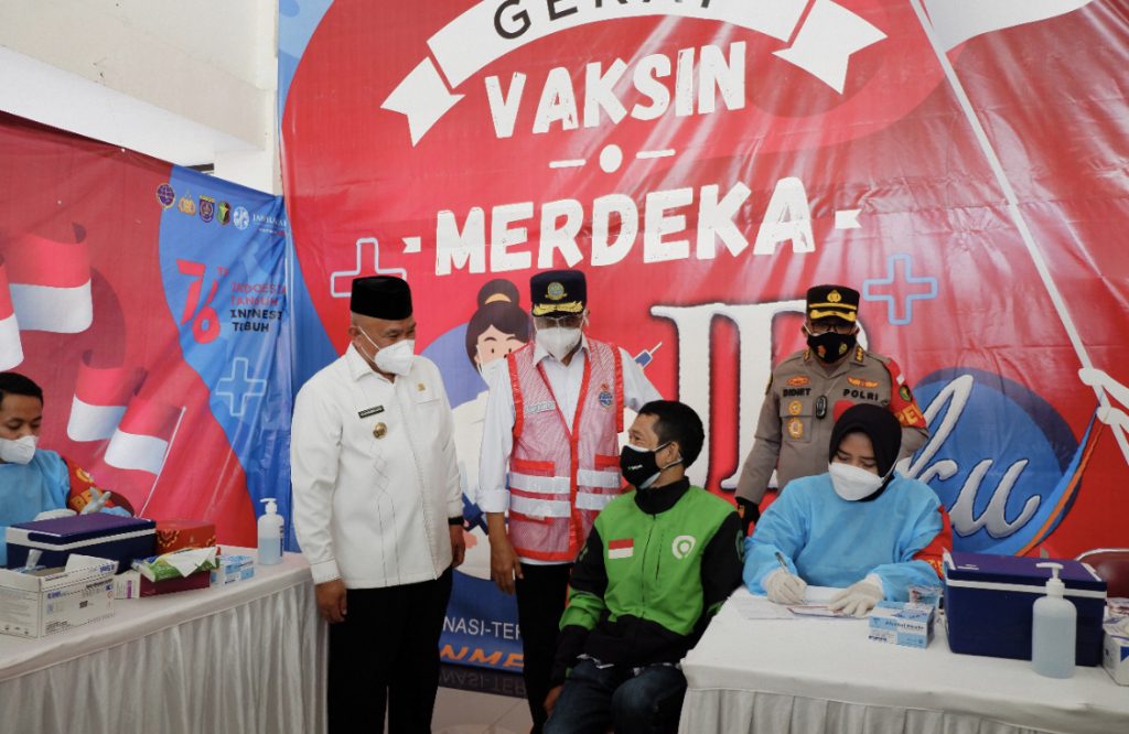 pojokdepok.com-Wali Kota Depok, Mohammad Idris meninjau pelaksanaan Gerai Vaksin Merdeka yang digelar Badan Pengelola Transportasi Jabodetabek (BPTJ), Polri dan PT. Jasa Raharja (Persero) di Terminal Jatijajar Rabu (11/08/2021). Dalam tinjauannya tersebut, Mohammad Idris bersama Menteri Perhubungan (Menhub), Budi Karya Sumadi melihat mekanisme