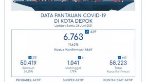 pojokdepok.com- Pemerintah Kota (Pemkot) Depok kembali memperbarui data perkembangan kasus virus Corona atau Covid-19. Berdasarkan data yang dirilis per tanggal 26 Juni 2021, jumlah pasien sembuh menjadi 50.419 orang atau mencapai 86,60 persen. Jumlah pasien sembuh setiap harinya terus bertambah. Dalam rilis
