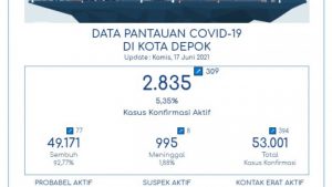 pojokdepok.com– Pemerintah Kota (Pemkot) Depok kembali memperbarui data perkembangan kasus virus Corona atau Covid-19. Berdasarkan data yang dirilis per 17 Juni 2021, jumlah pasien sembuh menjadi 49.171 orang atau mencapai 92,77 persen. Jumlah pasien sembuh setiap harinya terus bertambah. Dalam rilis tersebut,