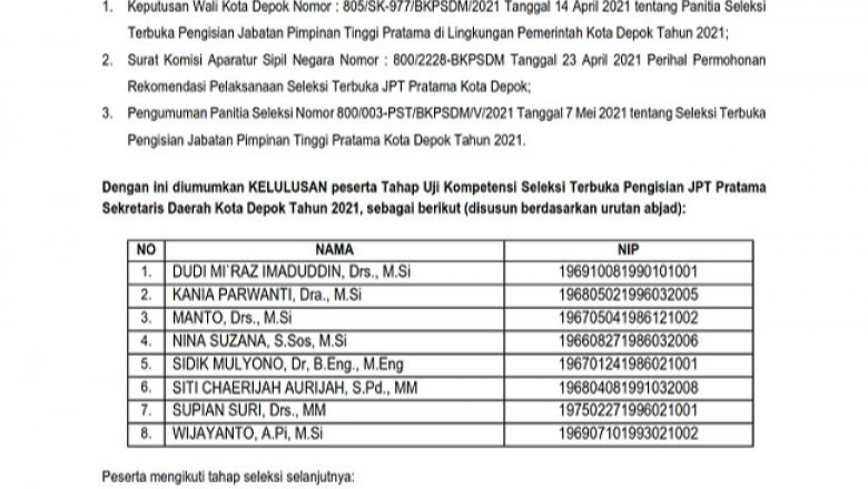 Dalam surat tersebut menyebutkan, terdapat delapan nama calon Sekda Kota Depok yang berhasil lolos dalam tahap uji kompetensi. Yaitu Kepala Dinas Perumahan dan Pemukiman (Disrumkim) Dudi Mi’raz, Sekretaris DPRD Depok Kania Parwanti, Kepala Dinas Tenaga Kerja (Disnaker) Manto, Kepala Badan Keuangan Daerah (BKD) Nina Suzana.