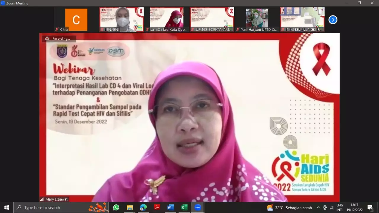 pojokdepok.com- Dinas Kesehatan (Dinkes) Kota Depok menggelar Webinar bagi tenaga kesehatan dengan tema Interpretasi Hasil Laboratorium CD 4 dan Viral Load terhadap Penanganan Pengobatan Orang Dengan HIV (ODHIV) dan Standar Pengambilan Sampel pada Rapid Test Cepat HIV dan Sifilis. Kegiatan tersebut dilaksanakan dalam rangka Hari AIDS Sedunia Tahun 2022.