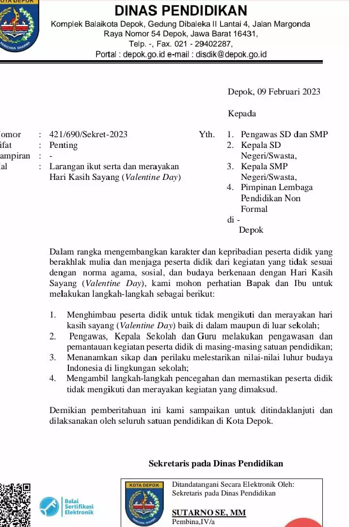 pojokdepok.com- Dinas Pendidikan (Disdik) Kota Depok mengeluarkan Surat Edaran (SE) tentang Larangan Ikut Serta dan Merayakan Hari Kasih Sayang atau Valentine Day. Surat bernomor 421/690/Sekret-2023 tersebut, diharapkan menjadi landasan bagi pelajar untuk tidak merayakan Hari Kasih Sayang yang jatuh setiap 14 Februari.