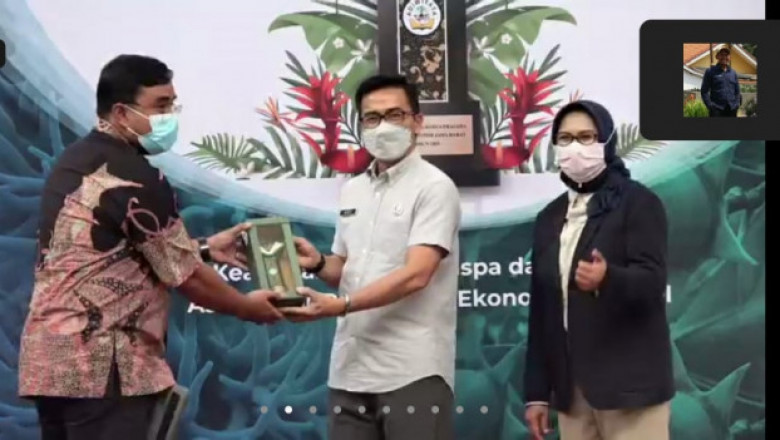 Kepala Seksi Pengurangan Sampah dan Kemitraan Lingkungan, DLHK Kota Depok, Rolliansjah Dalius (kiri) saat mewakili DLHK Kota Depok menerima penghargaan anugerah Raksa Prasada, di Gedung Sate, Bandung, Selasa (23/11/21). (Foto: istimewa)