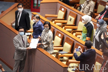 Menteri Perencanaan Pembangunan Nasional/Kepala Badan Perencanaan Pembangunan Nasional Suharso Monoarfa memberikan pandangan pemerintah kepada Ketua DPR Puan Maharani dalam rapat paripurna ke-13 masa sidang 2021-2022 di Gedung Nusantara II, Kompleks Parlemen MPR/DPR-DPD, Senayan, Jakarta, Selasa (18/1/2022). Dalam rapat paripurna tersebut, DPR mengesahkan Rancangan Undang-Undang Ibu Kota Negara (RUU IKN) menjadi undang-undang. pojokdepok.com -/Sopian