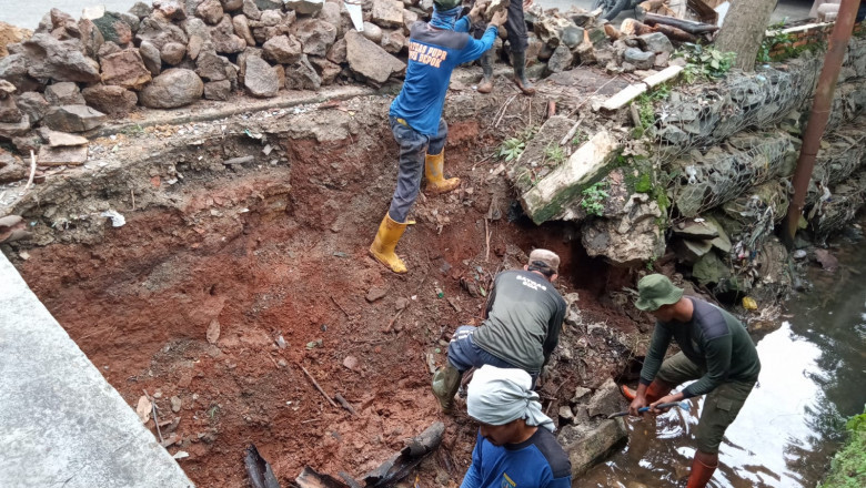 pojokdepok.com- Dinas Pekerjaan Umum dan Penataan Ruang (DPUPR) Kota Depok mengerahkan sebanyak satu regu Satuan Tugas (Satgas) yang terdiri dari 10 personel untuk melakukan penanganan longsor turap di depan SDN 1 Beji, Kecamatan Beji. Longsor yang terjadi kemarin (14/03), disebabkan intensitas hujan yang tinggi, sehingga kali tidak mampu menampung debit air dan membuat rongga pada turap.