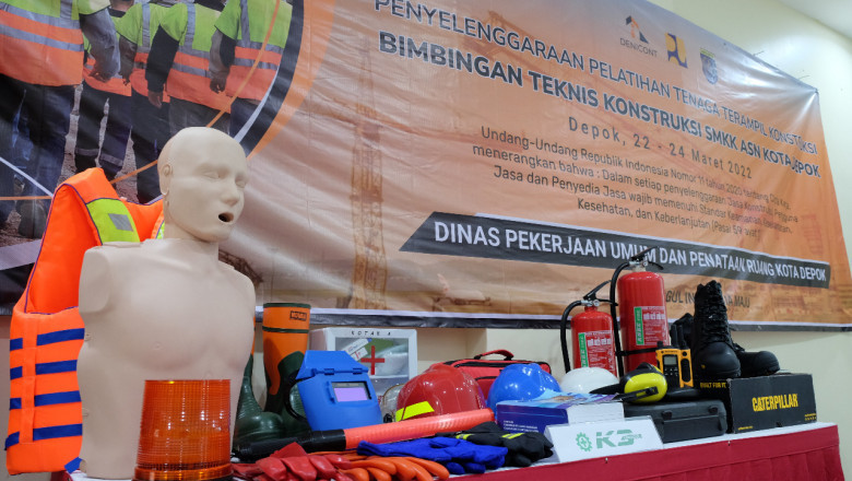 Perlengkapan K3 saat ditampilkan DPUPR Kota Depok pada kegiatan Sistem Manajemen Keselamatan Konstruksi (SMKK) di Sasono Mulyo, Kalimulya, Rabu (23/03/22). (Foto: JD 01/Diskominfo).