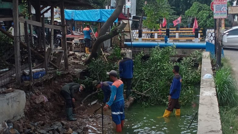 Satgas Dinas PUPR Kota Depok melakukan perbaikan sementara ambrolnya turap Outlet Situ Cilangkap, Kelurahan Cilangkap, Kecamatan Tapos, Rabu (15/12/21). (Foto: istimewa)
