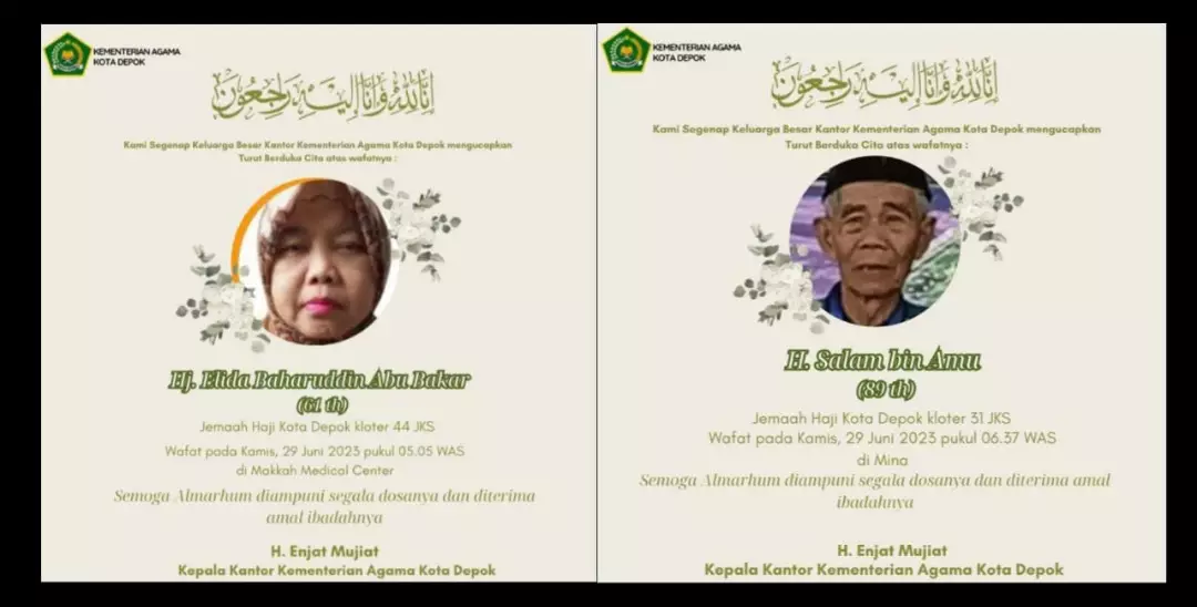 Kepala Seksi (Kasi) Penyelenggara Haji dan Umrah (PHU) Kantor Kementerian Agama (Kemenag) Kota Depok, Yuli Rachmawati, membenarkan terkait kabar duka ini. Kedua jemaah wafat di Kota Mina dan Mekkah.