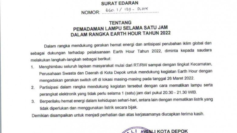 Imbauan ini disampaikan melalui Surat Edaran Wali Kota Nomor 660.1/129-DLHK tentang Pemadaman Lampu Selama Satu Jam Dalam Rangka Earth Hour Tahun 2022, yang diberikan untuk Perangkat Daerah (PD), Kecamatan, serta Lurah untuk diteruskan ke masyarakat. Dengan harapan, seluruh elemen masyarakat Kota Depok juga turut mendukung gerakan Earth Hour.