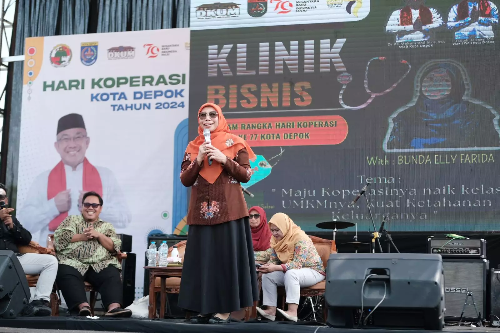pojokdepok.com – Ketua Dewan Kerajinan Nasional Daerah (Dekranasda) Kota Depok, Elly Farida menjadi narasumber dalam acara talkshow klinik bisnis bertemakan Maju Koperasinya, Naik Kelas UMKM-nya, Kuat Ketahanan Keluarganya.