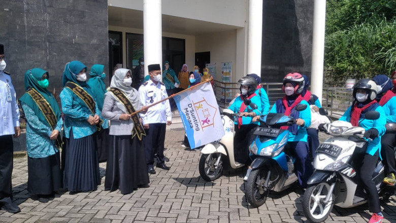 Ketua TP-PKK Kota Depok, Elly Farida didampingi Camat dan Lurah Pancoran Mas melepas rombongan Ojek Cantik Membawa Makanan Balita Stunting (Ocan Bananas) yang membawa makanan bergizi seimbang untuk anak-anak stunting, saat Gebyar Aksi D’Sunting Menara, di Halaman Kantor Kelurahan Pancoran Mas, kemarin (16/03/22). (Foto: istimewa).