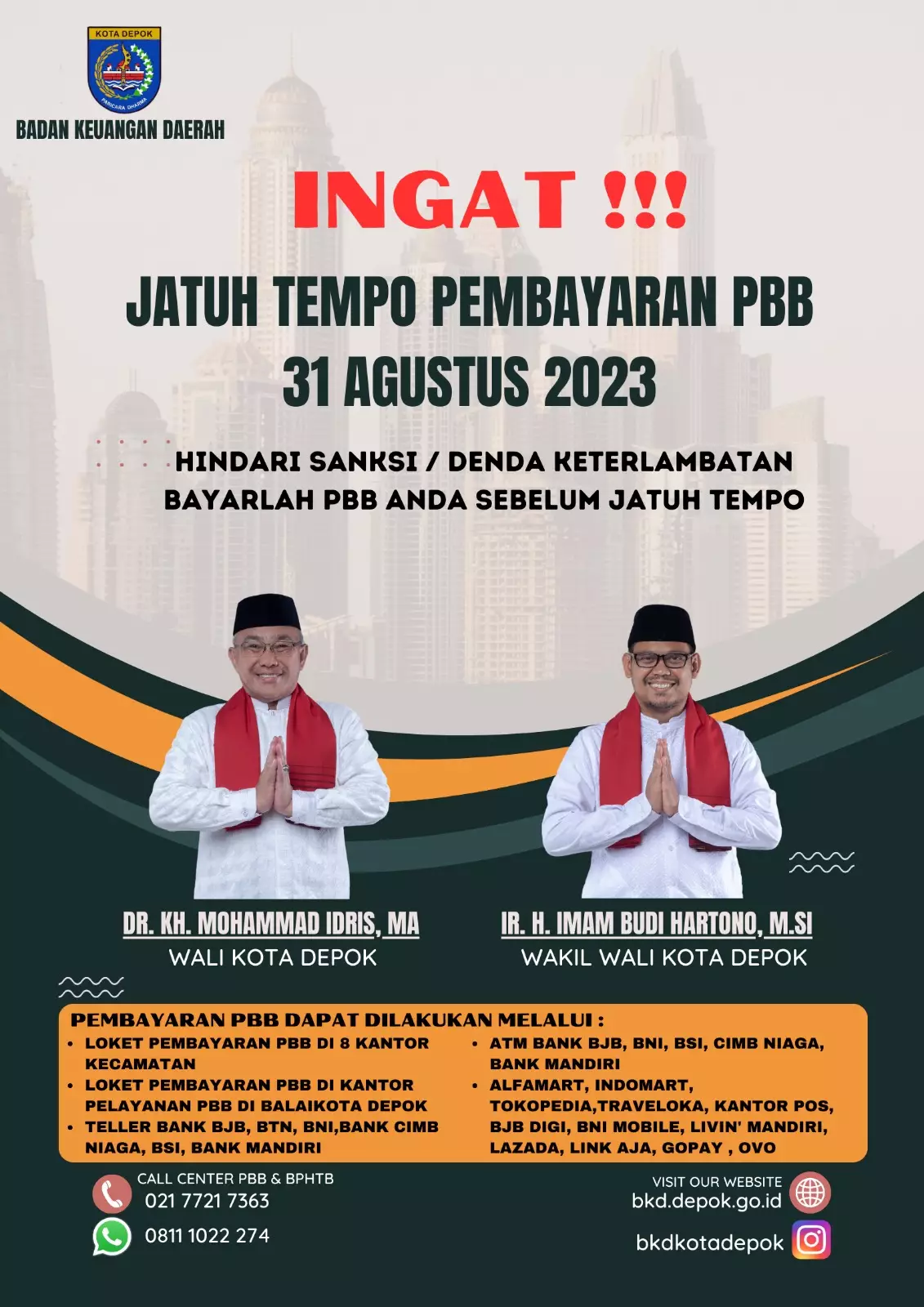pojokdepok.com – Badan Keuangan Daerah (BKD) Kota Depok mengingatkan tenggat atau deadline pembayaran Pajak Bumi dan Bangunan Perdesaan dan Perkotaan (PBB P-2) adalah hari ini, Kamis (31/08/23).