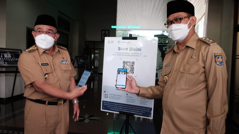 Wali Kota Depok Mohammad Idris (kiri) dan Wakil Wali Kota Depok Imam Budi Hartono menjajal scan barcode dengan aplikasi PeduliLindungi di Gedung Balai Kota Depok, (Foto: JD01/Diskominfo)