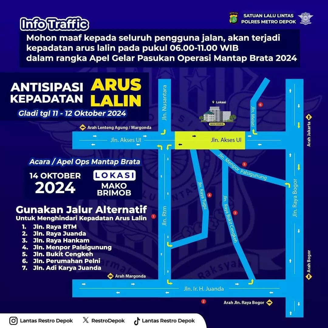 “Kami meminta maaf atas ketidaknyamanan yang mungkin dirasakan masyarakat. Silakan gunakan jalur alternatif,” kata Kasat Lantas Polres Metro Depok, Kompol Multazam Lisendra, Minggu (13/10/24).