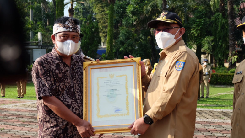 Wali Kota Depok, Mohammad Idris saat menyerahkan penghargaan lomba Apresiasi Kampung KB tingkat Provinsi Jawa Barat Tahun 2021 kepada Ketua Kampung KB Cempaka RW 09 Depok Jaya, Nurdiansyah usai apel pagi di lapangan Balai Kota Depok. (Foto : JD01/Diskominfo)