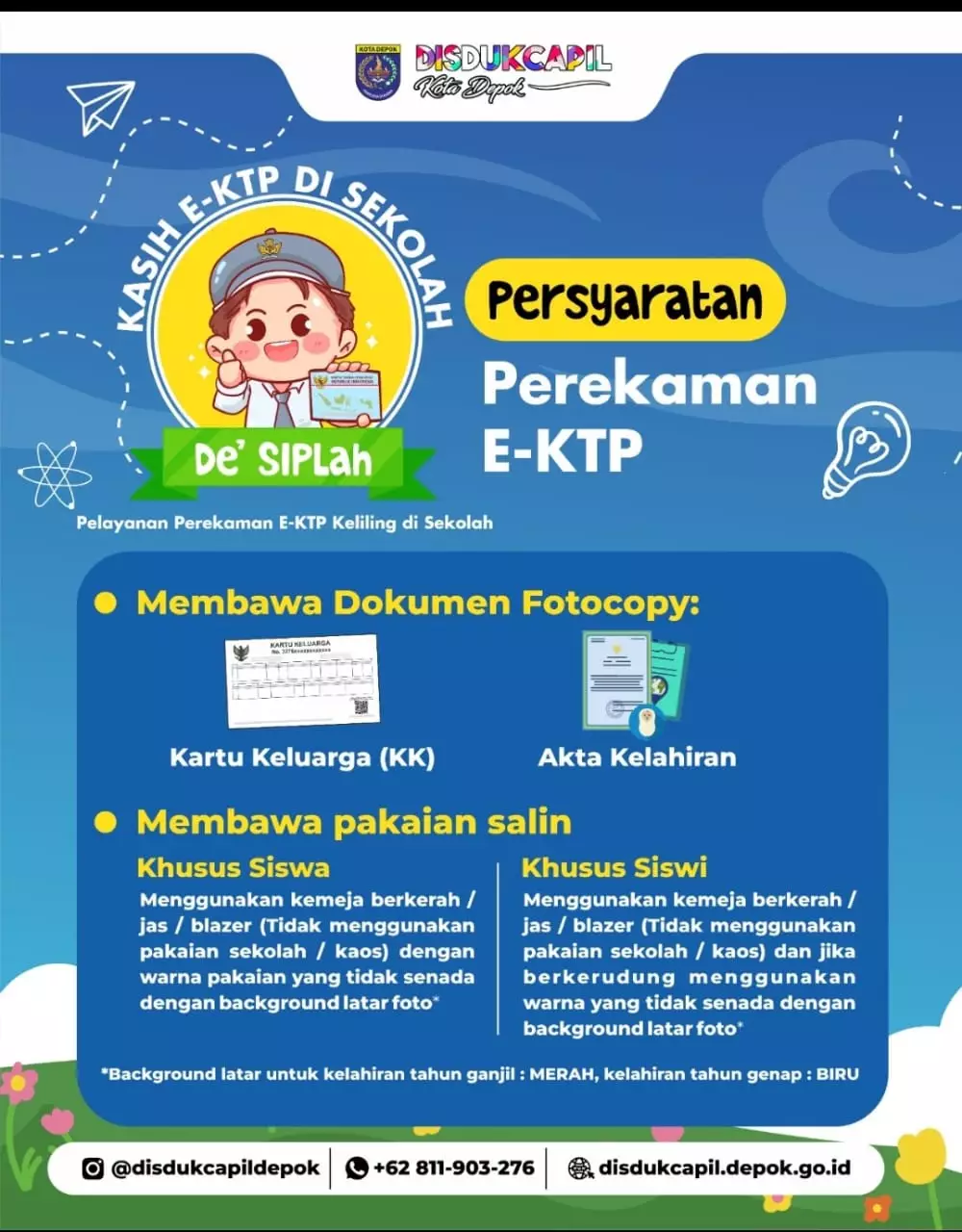 “Siswa diarahkan untuk membawa pakaian ganti yang berkerah dan tidak senada dengan background foto. Untuk kelahiran tahun ganjil berwarna merah dan genap berwarna biru,” jelasnya.