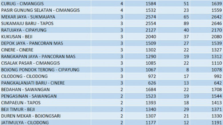 Selain itu, terdapat juga sejumlah kelurahan dengan hanya satu kasus positif. Antara lain Kelurahan Pangkalan Jati, Duren Seribu, Krukut, Pondok Jaya, Gandul, Tirtajaya, Mampang, Pondok Petir, Sukmajaya, dan Depok.