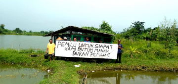 “Pemilu untuk siapa? Kami butuh makan, bukan Pemilu,” demikian bunyi tulisan dalam spanduk yang dibentangkan para petani, seperti nampak pada foto di atas.