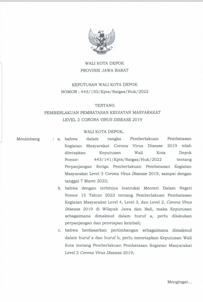 Pojok Depok, Kota Depok per 8 Maret 2022 kembali menerapkan Pemberlakuan Pembatasan Kegiatan Masyarakat (PPKM) Level 2 hingga 14 Maret 2022. Guna mengatur jalannya PPKM tersebut, Pemerintah Kota (Pemkot) Depok mengeluarkan keputusan Wali Kota Depok Nomor 443/150/Kpts/Satgas/Huk/2022.
