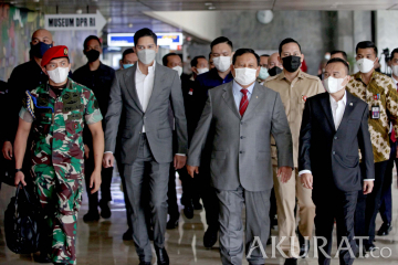 Menteri Pertahanan Prabowo Subianto menyapa anggota DPR saat menghadiri rapat kerja dengan Komisi I di Nusantara II, Kompleks Parlemen MPR/DPR-DPD, Senayan, Jakarta, Kamis (27/1/2022). Rapat kerja gabungan dengan Menkeu dan Kasal ini membahas meminta persetujuan Barang Milik Negara Berupa Kapal Eks KRI Teluk Mandar 514 dan KRI Teluk Penyu 513 pada Kementerian Pertahanan. pojokdepok.com -/Sopian