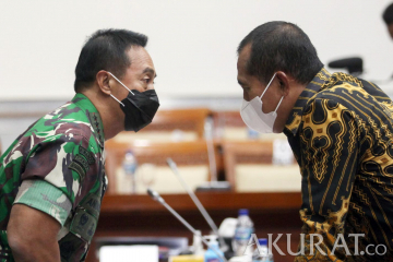 Panglima TNI Jenderal Andika Perkasa saat rapat kerja dengan Komisi I di Ruang Komisi, Nusantara II, Kompleks Parlemen MPR/DPR-DPD, Senayan, Jakarta, Senin (24/1/2022). Rapat ini membahas agenda pencapaian target program MEF TNI tahun 2021, skenario TNI terhadap dinamika keamanan di Laut Cina Selatan dan Indo Pasifik, perkembangan penanganan kasus-kasus hukum prajurit TNI, serta strategi dan pendekatan TNI dalam menyelesaikan permasalahan di Papua dan Papua Barat. pojokdepok.com -/Sopian
