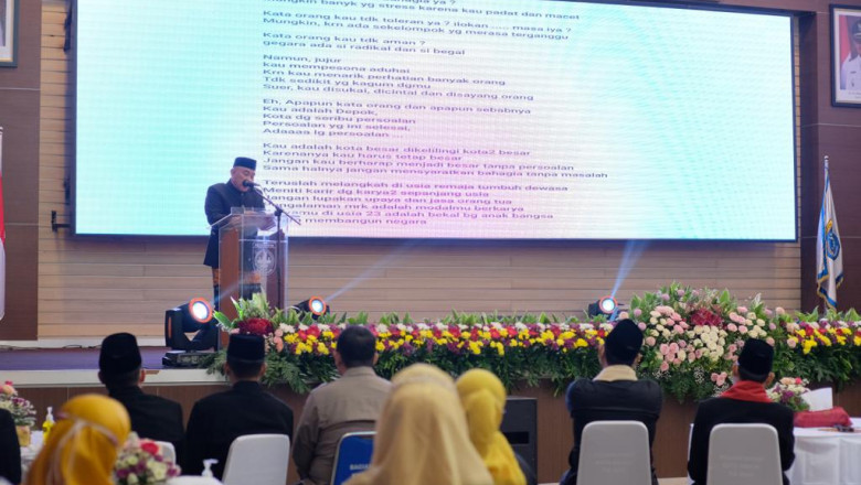 Wali Kota Depok Mohammad Idris saat memberikan sambutan pada puncak acara Hari Jadi ke-23 Kota Depok, di Aula Lantai 10, Gedung Dibaleka II, kemarin (27/04/22). (Foto: JD 04/Diskominfo)