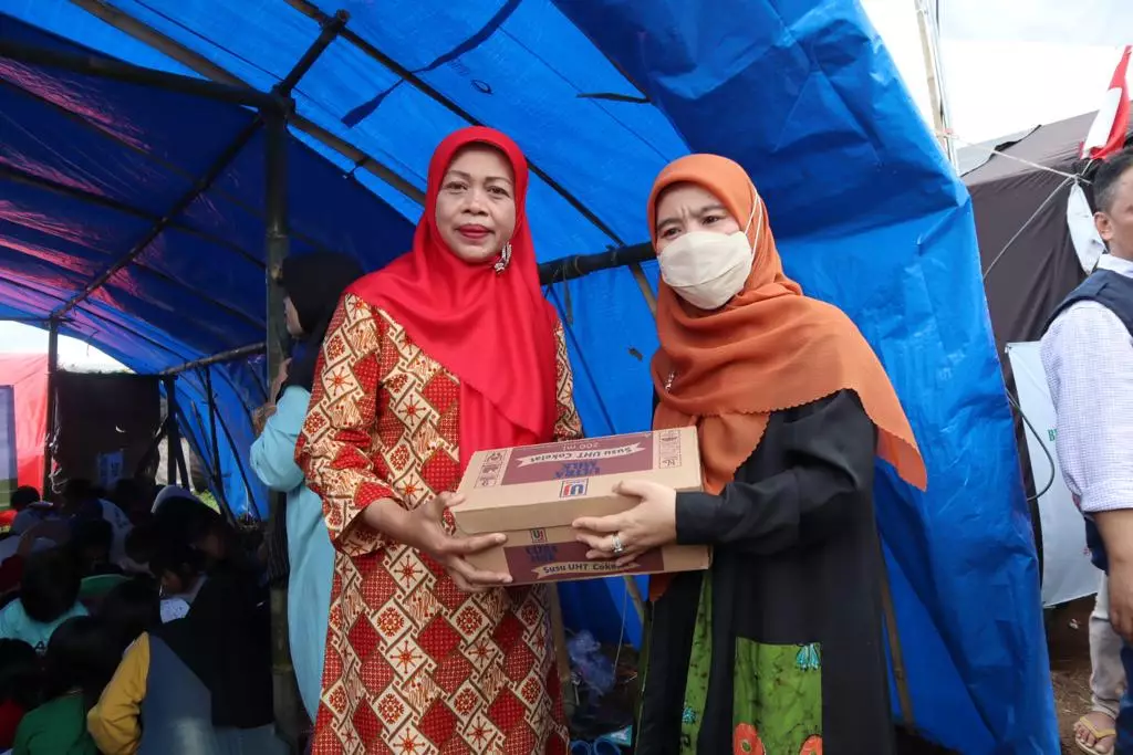 pojokdepok.com- Ketua Dharma Wanita Persatuan (DWP) Kota Depok, Siti Barkah Hasanah Supian Suri meninjau langsung posko darurat di RT 05/RW 04, Desa Ciherang, Kecamatan Pacet, Kabupaten Cianjur. Kedatangannya bersama rombangan, untuk menghibur para pengungsi yang ada di sana.