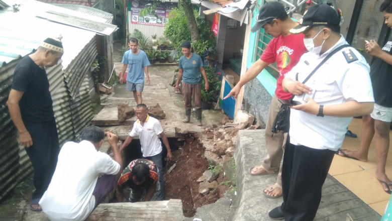 Lurah Kemirimuka, Denny Ferdian (paling kanan) bersama warga sekitar mengecek ambrolnya Jalan Lingkungan (Jaling) RT 04, RW18. (Foto : Istimewa)
