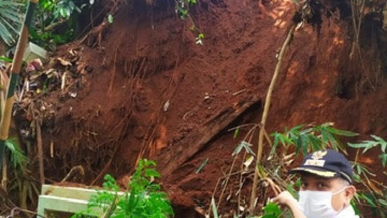 pojokdepok.com – Lurah Kemirimuka Denny Ferdian turun langsung meninjau lokasi longsor di area makam RW 09 Kemirimuka, Rabu (13/04/22). Tanah di area makam tersebut bergeser dan longsor ke bawah akibat cuaca hujan yang melanda Kota Depok beberapa hari ini.