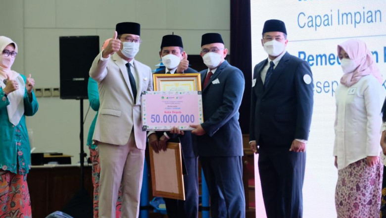 Wali Kota Depok Mohammad Idris (ketiga dari kanan) menerima apresiasi dari Gubernur Jawa Barat (Jabar) Ridwan Kamil (kelima dari kanan) pada acara puncak Peringatan Hari Ibu ke-93 Tingkat Provinsi Jabar di Gedung Merdeka Kota Bandung Rabu (22/12/21). (Foto: Istimewa)