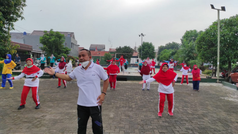 Ketua RW 03 Depok Jaya, Nuryadin saat mengikuti senam jantung sehat bersama warganya dalam kegiatan Minggu Ceria, Kemarin (16/01/22). (Foto: istimewa)