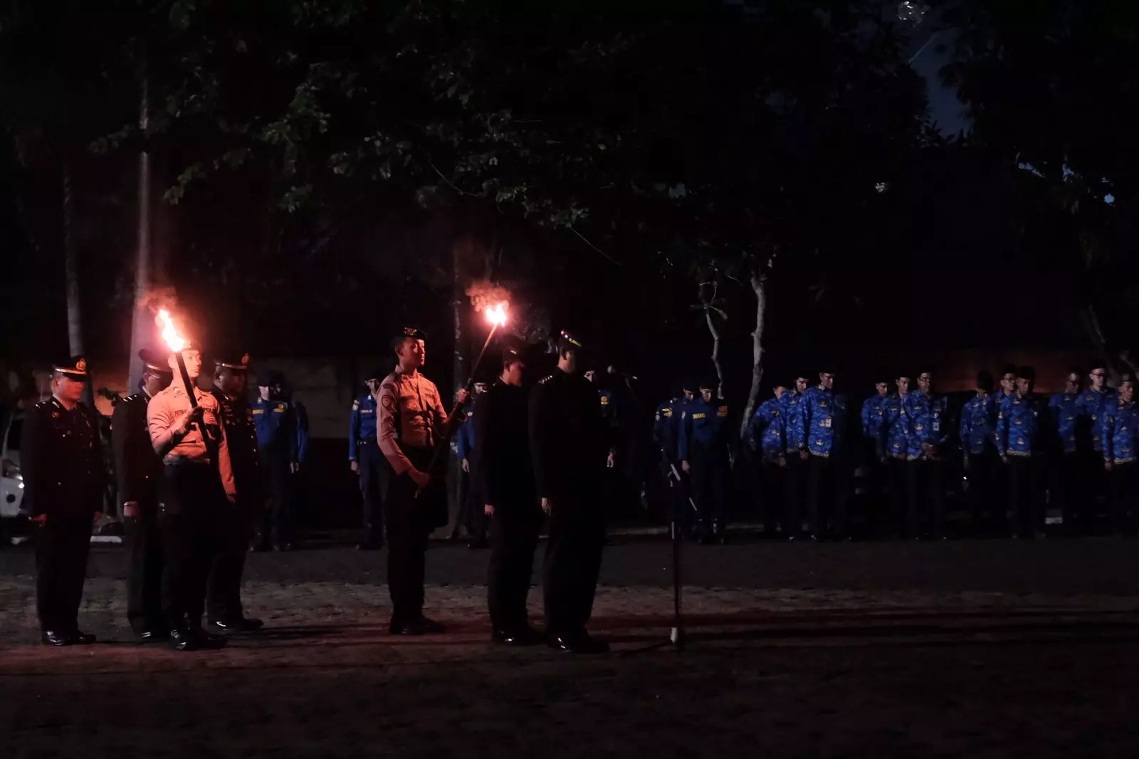 Cahaya obor tampak menerangi para peserta kegiatan apel kehormatan dan malam renungan suci pada Hari Ulang Tahun (HUT) ke-79 Republik Indonesia (RI) pada Sabtu 17 Agustus tengah malam.