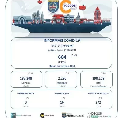 pojokdepok.com – Pemerintah Kota (Pemkot) Depok kembali memperbarui data perkembangan kasus Covid-19. Berdasarkan data yang dirilis per tanggal 4 Mei 2023, kasus pasien sembuh terus mengalami penambahan. Pada data tersebut, terdapat penambahan pasien sembuh sebanyak 13 orang. Dengan demikian, totalnya menjadi 187.208
