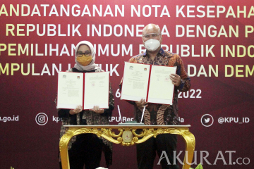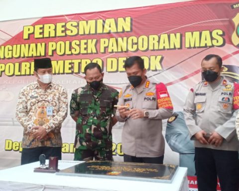 Kapolres Metro Depok Kombes Imran Edwin Siregar (tengah) didampingi Dandim 0508/Depok Kolonel Inf. Aulia Fahmi Dalimunte, Kapolsek Pancoran Mas Kompol Triharijadi, Camat Pancoran Mas Syaiful Hidayat dan Camat Cipayung Hasan Nurdin melakukan penandatanganan prasasti tanda peresmian Gedung Baru Mapolsek Pancoran Mas, di