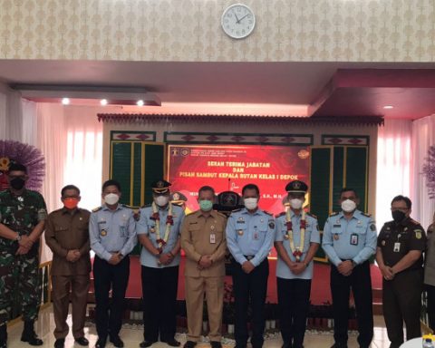 Asisten Pemerintahan dan Kesejahteraan Sosial pada Sekretariat Daerah (Sekda) Kota Depok, Sri Utomo (tengah) saat menghadiri Sertijab Karutan di Aula Serbaguna Rutan Kelas I Depok pada Senin (20/12/21). (Foto : Istimewa) pojokdepok.com – Rumah Tahanan Negara (Rutan) Kelas I Depok memiliki pimpinan baru.