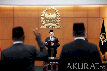 Ketua MPR Bambang Soesatyo (tengah) didampingi Wakil Ketua MPR Ahmad Basarah memimpin pembacaan sumpah dan janji Anggota MPR Pengganti Antar Waktu (PAW) di Ruang Delegasi, Gedung Nusantara V, Kompleks Parlemen MPR/DPR-DPD, Senayan, Jakarta, Kamis (18/11/2021). Ketua MPR melantik 5 Anggota MPR Pengganti Antar