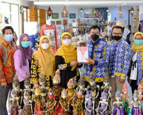 Ketua Dekranasda Kota Depok, Elly Farida menerima bingkisan dari Koordinator Bidang Kreatif Dekranasda Provinsi Jawa Barat, Muhammad Irfan, usai melakukan Kunjungan Kerja di Gedung Dekranasda Jawa Barat, Kota Bandung, Kamis (18/11/21). (Foto: JD 04/Diskominfo) pojokdepok.com – Dewan Kerajinan Nasional Daerah (Dekranasda) Kota Depok