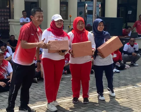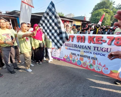 pojokdepok.com – Sekretaris Daerah (Sekda) Kota Depok Supian Suri melepas 1.000 peserta gerak jalan sehat di Kelurahan Tugu, Sabtu (19/08/23). Gerak jalan sehat tersebut dilaksanakan dalam rangka memeriahkan Hari Ulang Tahun ke-78 Republik Indonesia (RI). “Alhamdulillah bisa ke Tugu lagi. Bisa melepas