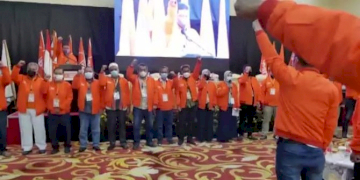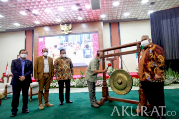 Wakil Ketua DPD Nono Sampono memukul gong disaksikan Wakil Ketua DPD Sultan Bachtiar Najamudin, Wakil Ketua DPR Racmat Gobel, dan Gubernur Sulawesi Tenggara Ali Mazi (kanan) saat membuka acara dialog Badan Kerjasama (BKS) Provinsi Kepulauan di Nusantara IV, Kompleks Parlemen MPR/DPR-DPD, Senayan,